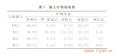 表1為頁巖樣品黏土礦物相對含量分析結(jié)果。從分析結(jié)果可以看出,儲層黏土礦物類型和含量相差較大,主要以伊利石為主。頁巖礦物的相對含量和儲層膠結(jié)物含量變化將會影響頁巖的巖石力學性質(zhì)、孔隙結(jié)構、氣體吸附能力等。石英含量影響頁巖的脆性,石英和碳酸鹽礦物含量越多,頁巖脆性越高,頁巖的孔隙越少,游離頁巖氣的儲集空間越少;方解石的膠結(jié)作用會導致儲層孔隙減少。黏土礦物表面積較大,微孔隙較多,當水未飽和時對頁巖氣有較強的吸附能力。