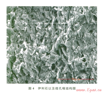 圖4、5是掃描電鏡觀測到的伊利石和綠泥石分布狀態(tài)。伊利石的吸附流體作用在TOC較低的頁巖中有很重要的影響。絨球狀綠泥石一般不具有膨脹性,只有在水鎂石八面體晶片酸蝕失玄了Mg2+、Fe3+的條件下才會導致水鎂石解體出現(xiàn)晶間膨脹。