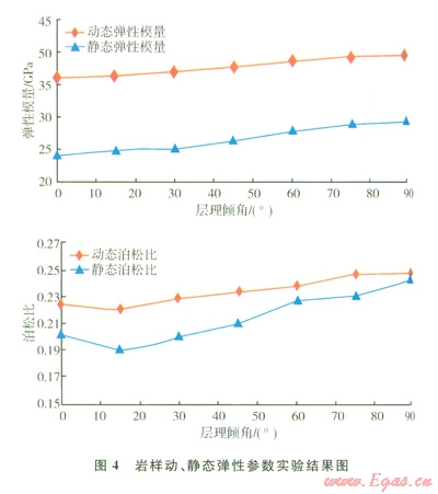 圖4為根據(jù)表2的實(shí)驗(yàn)結(jié)果得出的動態(tài)彈性模量、泊松比和靜態(tài)彈性模量、泊松比隨層理傾角的變化圖。
