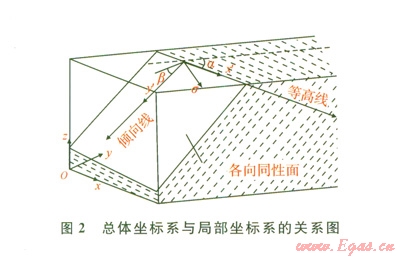 在實(shí)際工程中,由于地層存在一定的走向和傾角,通常和上述坐標(biāo)系不一致,如圖2所示。需要選用總體坐標(biāo)系(x,y,z)。總體坐標(biāo)系(x,y,z)和各向異性定向坐標(biāo)系(x',y',z')的關(guān)系可通過走向角(α)和傾向角(α)建立。
