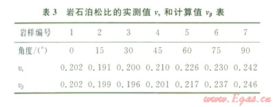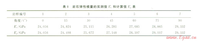 從表2可以看出,計(jì)算的彈性模量與實(shí)測值接近,最大誤差為3%。因此,只要對巖石作平行和垂直層理以及45°方向的3組樣品單軸壓縮實(shí)驗(yàn),就可用計(jì)算值來代替樣品的實(shí)測值,而不需要對每一個方向(β角)的樣品進(jìn)行單軸壓縮實(shí)驗(yàn)來確定模量,可省去大量樣品加工及實(shí)驗(yàn)工作。結(jié)果表明將層理巖石視為橫觀各向同性介質(zhì)來計(jì)算彈性模量是可行的。