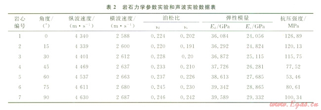 由聲波實(shí)驗(yàn)結(jié)果根據(jù)式(13)、(14)計(jì)算各巖樣的動態(tài)彈性模量和動態(tài)泊松比,計(jì)算結(jié)果列于表l。