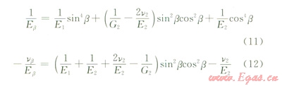 由于在β=45°情況下,v2E1=vlE2,可得與z軸為任意角度β方向的彈性模量Eβ和泊松比vβ: