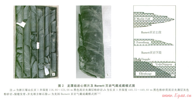 從表l中可以看出,龍?zhí)督M頁巖的TOC、R0、厚度以及地層的頂?shù)钻P(guān)系都較Lewis頁巖有更好的頁巖氣前景,而且從地層的頂?shù)钻P(guān)系來看(表1),與美國Barnett頁巖所處的地層格局(圖2-c)有很大的相似性,有利于頁巖氣的后期保存。