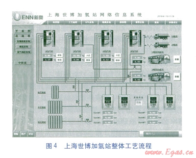 上海世博會專用燃料電池加氫站考慮到站外制氫加氫站結(jié)構(gòu)配置相對簡單,而且成本相對比較低,建造時間比較短等優(yōu)點,故采用站外制氫加氫站類型。氫氣氣源來自上海焦化廠副產(chǎn)氫氣(備用氣源為法國液化空氣集團(tuán)公司所制氫氣),經(jīng)過提純后以高壓氫氣形式用管束拖車運輸?shù)郊託湔緝?nèi)儲存。上海世博加氫站整體工藝流程見圖4。管束拖車到站后,經(jīng)卸氣柱卸氣進(jìn)入壓縮機(jī),經(jīng)壓縮機(jī)增壓后。分別儲存在高、中、低三級儲氣瓶組。加氫時,加氣機(jī)按照低、中、高壓力順序取氣。