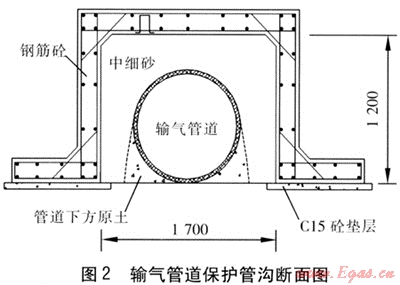 A號路為城市快速路,建設(shè)標(biāo)準(zhǔn)高,路面結(jié)構(gòu)厚度約80cm,路基需要分層碾壓以滿足道路密實度要求??紤]到輸氣管道設(shè)計壓力高,環(huán)向應(yīng)力大,為保證管道在道路施工及今后運行中的安全,我們對A號路車行道下的輸氣管道采用管溝保護(見圖2,圖中尺寸單位為mm,以下同)。管溝內(nèi)壁與輸氣管道之間凈距不小于50cm,采用現(xiàn)澆施工,兩端伸出道路邊緣2m,并要求施工中盡量保留輸氣管道周圍的原土,避免破壞管道防腐層。