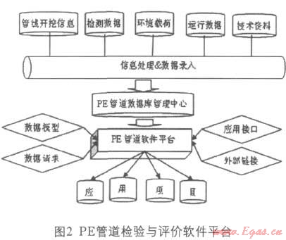 軟件平臺(tái)是IT技術(shù)在PE管道檢驗(yàn)與評(píng)價(jià)中的應(yīng)用?;跀?shù)據(jù)庫(kù)技術(shù)構(gòu)建PE管道信息數(shù)據(jù)庫(kù),有效管理PE管道數(shù)據(jù),從而實(shí)現(xiàn)管道信息共享,并利用信息數(shù)據(jù)庫(kù)編制PE管道風(fēng)險(xiǎn)評(píng)估系統(tǒng),構(gòu)建以風(fēng)險(xiǎn)檢驗(yàn)為核心的PE燃?xì)夤艿腊踩u(píng)價(jià)軟件應(yīng)用平臺(tái)。PE管道檢驗(yàn)與評(píng)價(jià)軟件平臺(tái)如圖2所示。