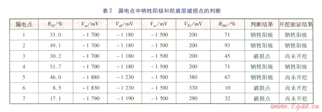 如果RIRC大于等于0.6,則可判斷此處金屬表面防腐層的電阻很小,預測為犧牲陽極;如果RIRC1,則不排除此處管道上伴隨有防腐層破損情況;如果RIRC小于0.6,則表明此處金屬表面防腐層的絕緣電阻還比較大,可以判斷為防腐層破損。此處的0.6是一個經(jīng)驗性數(shù)值,按此判斷是否精準,還需要更多的實踐來證實。根據(jù)此方法,對7處漏電點的判斷結果見表2。