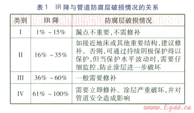 IR降越大,陰極保護程度越低,即埋地管道防腐層缺陷面積越大,可見DCVG能夠較準確地預測防腐層缺陷的面積,并能對整個管道的陰極保護效果做出客觀的判斷。IR降與防腐層破損情況的關系見表1