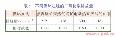 根據(jù)表3的數(shù)據(jù),由式(6)可以計(jì)算得到不同供熱過程韻二氧化碳排放量(見表4)。由表4可知,燃煤鍋爐的二氧化碳排放量最大,天然氣熱泵排放量最小,天然氣鍋爐與電動(dòng)熱泵的排放量居中。