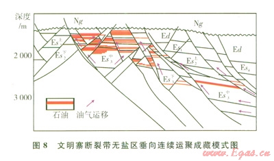 該成藏模式主要分布于無鹽巖發(fā)育的復雜斷裂帶,屬于常壓環(huán)境油氣藏的油氣成藏模式類型。這種模式油氣藏的油氣主要是在浮力作用下沿斷裂向上連續(xù)運移。以文明寨地區(qū)為代表(圖8)。該成藏模式具有如下特點:①具有沙三上、中、下亞段3套烴源巖供烴;②以垂向連續(xù)運移為主,側向運移為輔;③圈閉類型主要為斷塊圈閉;④運移動力主要是浮力;⑤縱向上烴類聚集層系沿主干斷裂呈羽狀分布。