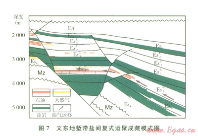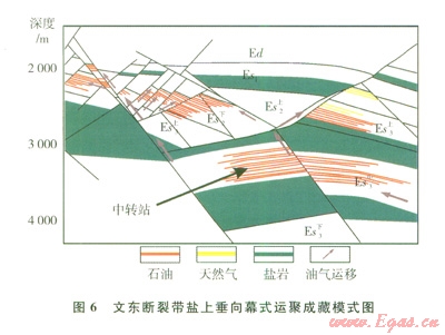 屬于鹽上油氣藏的油氣成藏模式類型。斷裂帶下部鹽間或鹽下地層中的砂體是油氣幕式運移的臨時倉儲層或“中轉站”,由于下部流體的超壓作用,這些砂體中的流體沿斷層周期性釋放而將油氣大量轉移到上部地層。主要發(fā)生于斷裂活動期,具有早期充注的特點,以衛(wèi)城地區(qū)向南至文留地區(qū)為代表(圖6)。該成藏模式具有如下特點:①具有沙三上、中、下亞段3套烴源巖供烴;②以垂向幕式運移為主、側向運移為輔;③圈閉類型主要為復雜斷塊圈閉;④運移動力主要是超壓;⑤縱向上烴類聚集層系沿主干斷裂呈羽狀分布。