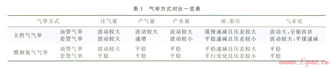 氣舉氣源主要有膜制氮?dú)夂吞烊粴?/font>[7]。鄰井有高壓氣的井選天然氣氣舉,鄰井沒(méi)有高壓氣的井選擇膜制氮?dú)鈿馀e。膜制氮?dú)鈿馀e比天然氣氣舉在注氣量、產(chǎn)氣量、產(chǎn)水量等方面更平穩(wěn)(表1)。