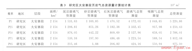 通過統(tǒng)計出的每口井含氣頁巖層段的厚度,可以繪制出含氣頁巖層段厚度等值線圖,同時結(jié)合地震資料追蹤有效層段,控制平面上等值線的走勢。根據(jù)研究區(qū)塊大安寨段巖石物性分析測試數(shù)據(jù),大安寨段頁巖密度平均為2.61 g/cm3。根據(jù)實例井大安寨段實測TOC資料及現(xiàn)有的測井資料進行了多元統(tǒng)計分析擬合,計算出吸附氣量,繪制TOC等值線圖及吸附氣量等值線圖,計算出吸附氣資源量;根據(jù)實測孔隙度資料、現(xiàn)有的測井?dāng)?shù)據(jù)分別分析擬合、計算孔隙度,進而計算含水(氣)飽和度和游離氣百分含量,最終得到游離氣資源量;最后計算m該研究區(qū)不同概率的總資源量(表3)。