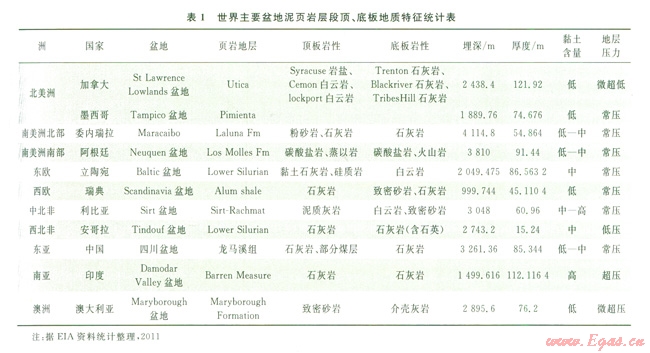 筆者通過文獻調(diào)研[5],對全球主要盆地含氣泥頁巖層段(系統(tǒng))頂、底板的地質(zhì)特征進行了統(tǒng)計。結(jié)果顯示(表1),世界范圍內(nèi)主要盆地頁巖地層頂、底板巖性以致密的泥頁巖、膏泥巖、膏鹽層、石灰?guī)r、白云巖、火山巖、煤層等為主,屬于非滲透或低滲透巖層。其埋深范圍從l