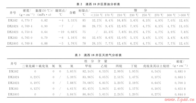 DX183與DX1805井的原油分析表可看出二者在黏度、含蠟量、初餾點(diǎn)、不同溫度下餾分百分比等方面差別都較大,這兩口井在天然氣密度、甲烷、氮?dú)?、二氧化碳這幾個(gè)組分的含量上也有較大差異(表2、3),因此,二者所產(chǎn)氣性質(zhì)差別較大,不是同一氣藏,所以DXl83井與DX1805井試采段應(yīng)不連通。