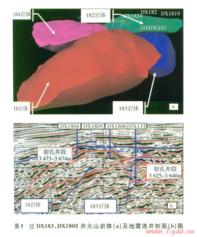同樣,對地質(zhì)資料分析表明(圖5),DX183井試采井段屬“183”次火山巖體,而DX1805井試采井段屬“18”次火山巖體,可以進(jìn)一步證實(shí)DX1183、DX1805試采井段不連通。