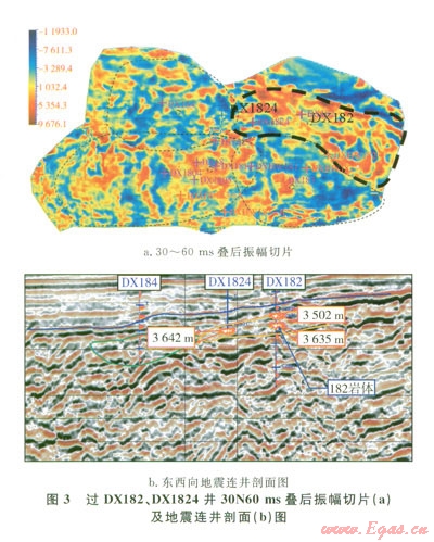 通過地震屬性分析、地震剖面刻畫進(jìn)行火山巖體輪廓追蹤識別及內(nèi)幕結(jié)構(gòu)精細(xì)解釋[10],可以清楚地看到DX182、DX1824井試采井段同屬“182”次火山巖體(圖3),其火山巖儲層的連續(xù)性好,這也從地質(zhì)上證明了DX182、DX1824兩口井連通。