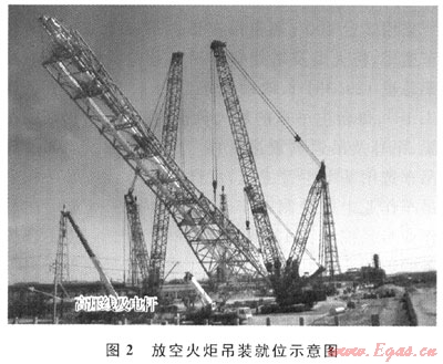 2009年6月16日和6月19日,采用整體滑移法分別完成了第1、2座放空火炬的吊裝,每座放空火炬的吊裝僅用了約50min,安全、順利、快捷,而且吊耳梁沒有任何變形。放空火炬吊裝就位示意圖如圖2所示。若采用分段吊裝、空中組對方案,不僅需要搭設(shè)高空組裝平臺(tái),安全風(fēng)險(xiǎn)大,進(jìn)度慢,而且要進(jìn)行2次400t履帶吊車塔式工況組裝和1次塔式工況拆除,至少需要11d時(shí)間,分段吊裝每座放空火炬又至少需要2d時(shí)間,此外,因占用400t吊車時(shí)間長,還會(huì)影響其他大型設(shè)備吊裝作業(yè),延緩工程施工工期。因此,采用分解吊點(diǎn)受力法整體吊裝放空火炬,不僅提前13d完成放空火炬吊裝任務(wù),節(jié)省400t履帶吊車租用費(fèi)36萬元,加快了整個(gè)工程大型設(shè)備吊裝進(jìn)度,特別是在施工現(xiàn)場緊缺吊耳梁材料的情況下,采用分解吊點(diǎn)受力的方法,成功解決了吊耳梁強(qiáng)度不足的難題,實(shí)現(xiàn)了吊耳梁以小代大的嘗試,圓滿完成了大型放空火炬吊裝任務(wù),在吊裝技術(shù)上是一種創(chuàng)新。