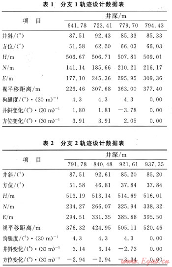 本文參考文獻(xiàn)[1]給出了Ai、Bi、Ci的計算方法,由式(7)、(8)求得煤層氣水平分支井三維軌跡設(shè)計的約束方程為:Lm1=Lm2,其有解的判別式為△=Bi2-4AiCi≥0(i=1,2)。因此,可精確求出造斜率K0,通過改變L1和L2可使K0逼近于工具造斜率K,從而設(shè)計出滿足約束條件的三維設(shè)計軌跡。