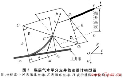 煤層氣水平分支井技術(shù)通過將主井眼和分支井眼部署在同一產(chǎn)層,在水平段主體井眼兩側(cè)側(cè)鉆分支來增加煤層的橫向動用程度,以此提高煤層氣井的開發(fā)效率。在國外,已開發(fā)出專門用于煤層氣水平分支井的軌跡設(shè)計軟件,并取得了很好的應(yīng)用效果;而國內(nèi)對煤層氣水平分支井的研究雖已取得了一定進(jìn)展,但仍有待于發(fā)展和完善。截至目前,國內(nèi)有關(guān)分支爬高高度和工具造斜率約束下煤層氣水平分支井軌跡設(shè)計的文獻(xiàn)尚未見報道,加之國外對其設(shè)計方法和模型算法尚未公開,限制了煤層氣水平分支井技術(shù)在我國的進(jìn)一步推廣和應(yīng)用。