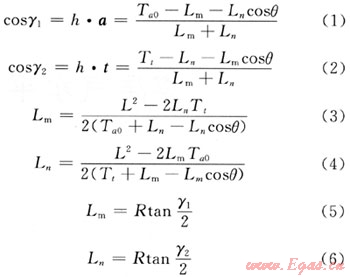 式中L為A1、B1兩點(diǎn)之距,Ta0和Tt分別為A1B1矢量a、t上的投影長度,θ為a、t之間的夾角。由式(1)~(6)求得: