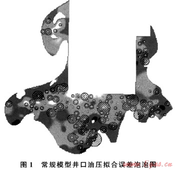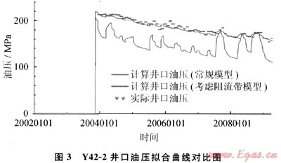 歷史擬合是對(duì)地質(zhì)模型參數(shù)場(chǎng)的修正,也是對(duì)地質(zhì)再認(rèn)識(shí)的過(guò)程。常規(guī)模型歷史擬合調(diào)參前井口油壓擬合較好的井有24口,占所有氣井的比例為18.2%,且多數(shù)井模型計(jì)算壓力較實(shí)際壓力偏高;考慮阻流帶的模型壓力擬合較好的井約有72口,所占比例達(dá)到54.5%,多數(shù)井計(jì)算壓力與實(shí)際壓力更加接近,空間擬合誤差對(duì)比圖見(jiàn)圖1、2。此外,阻流帶的引入還克服了歷史擬合參數(shù)調(diào)整有時(shí)范圍較大、不合理的弊端。Y42-2井試井解釋滲透率為0.4mD,表皮系數(shù)為-5.8,邊界面積1.71km2。常規(guī)模型需要將滲透率減小,油壓才能基本擬合上,且曲線變化趨勢(shì)仍然與實(shí)際存在較大偏差,顯然這種修改是不符合實(shí)際的。引入阻流帶以后,將滲透率減小為原來(lái)的50%,油壓迅速擬合到實(shí)際水平,壓力變化趨勢(shì)與實(shí)際相符(圖3),這也從另一方面證實(shí)了阻流帶的存在。由此可見(jiàn),考慮阻流帶之后歷史擬合工作變得更加容易,部分井甚至不需要調(diào)參即可完成擬合,進(jìn)一步證實(shí)了阻流帶模型的可靠性。值得注意的是:并不是所以井之間都存在阻流帶,還應(yīng)結(jié)合井間干擾分析成果,對(duì)部分井間連通區(qū)域進(jìn)行修改。通過(guò)反復(fù)修改參數(shù)場(chǎng),對(duì)每口井進(jìn)行了壓力和產(chǎn)水的擬合,得到模型最終計(jì)算儲(chǔ)量710.9×108m3,與地質(zhì)儲(chǔ)量719.21×108m3相差不大,誤差在5%以內(nèi),認(rèn)為修正后的模型能夠基本代表氣藏實(shí)際[8]。
