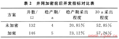 在完成歷史擬合的基礎(chǔ)上,對(duì)考慮阻流帶的模型進(jìn)行了計(jì)算,得到了更加準(zhǔn)確的氣藏剩余氣分布,Eclipse軟件能夠定量顯示每個(gè)網(wǎng)格單元剩余天然氣的地質(zhì)儲(chǔ)量。以此為基礎(chǔ),尋找儲(chǔ)量動(dòng)用程度低的“甜點(diǎn)”進(jìn)行局部加密。設(shè)計(jì)14口加密井,方案預(yù)測(cè)指標(biāo)見(jiàn)表2。從表2中可以看出:井網(wǎng)加密后,儲(chǔ)量動(dòng)用程度提高,氣田采收率增加了4.41%。