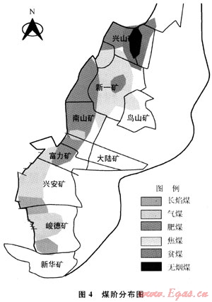 例如峻德、興安礦區(qū)主要為氣煤和長(zhǎng)焰煤,興安北部的富力、大陸、南山礦變?yōu)榉拭?,至新一礦深部、鳥(niǎo)山區(qū)變?yōu)榻姑?,再向北分布有貧煤和無(wú)煙煤(圖4)。因此煤變質(zhì)程度較高的南山、新一礦煤層瓦斯含量相應(yīng)增高,使得礦井瓦斯涌出量較大,屬高瓦斯突出礦區(qū)。