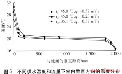 在不同供水溫度和流量下,室內(nèi)垂直方向溫度分布見圖5。由圖5可知:①隨著高度的增加,空氣溫度迅速降低,在距地面200mm處溫度基本達(dá)到穩(wěn)定,而在距地面1800mm以上溫度迅速降低。②隨著供水流量的增大與供水溫度的升高,各測點溫度也相應(yīng)升高,且在地面附近溫度差異明顯,在頂棚附近溫度沒有明顯變化。這種現(xiàn)象反映r熱管地板輻射采暖與普通地板輻射采暖的特點一致,即室內(nèi)空氣垂直方向溫度梯度小。