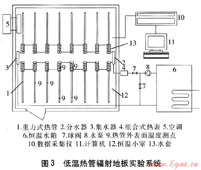 碳鋼/水重力式熱管(又稱碳鋼/水兩相閉式熱虹吸管)具有結(jié)構(gòu)簡單、成本低廉、傳熱性能優(yōu)良、工作可靠等特點,在冶金、化工、建材、動力等行業(yè)有很多成功的應(yīng)用實例[1]。隨著熱管技術(shù)的不斷成熟,其在建筑行業(yè)的應(yīng)用引起了學(xué)者們的關(guān)注。JEBRAIL等制作了熱管散熱器并測試了其熱工性能[2],國內(nèi)學(xué)者蔣愛華等對熱管輻射墻壁進行了探討[3],羅清海等分析了不同工質(zhì)熱管散熱器的熱工性能[4]。本文擬將碳鋼/水重力式熱管與地板輻射采暖系統(tǒng)結(jié)合起來,以期利用其優(yōu)良的傳熱性能,在提供舒適熱環(huán)境的同時,達(dá)到降低供水溫度、減小熱水循環(huán)流量、提高系統(tǒng)整體運行效率和經(jīng)濟性的目的。本文在重力式熱管和串聯(lián)熱管傳熱性能研究的基礎(chǔ)上[5],對低溫?zé)峁茌椛涞匕宓臒峁ば阅苓M行實驗研究。
