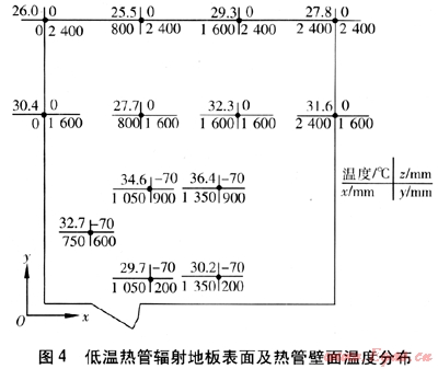 tg=45℃,qv=0.23m3/h的系統(tǒng)運行穩(wěn)定后,輻射地板表面及熱管壁面的溫度分布見圖4。其中,原點0位于地板的左下角,x、y、z分別為沿恒溫小室長、寬、高方向的坐標(biāo),地板所在平面z=0。