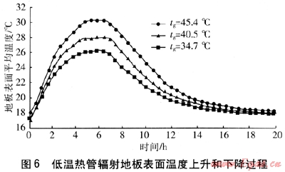 ① 熱管輻射地板在供水溫度為35~45℃時即可滿足采暖要求,比常規(guī)塑料埋管地板要求的供水溫度降低5℃左右。熱管輻射地板可以與低品位能源如太陽能、地?zé)崮艿戎苯咏Y(jié)合應(yīng)用于采暖系統(tǒng)。