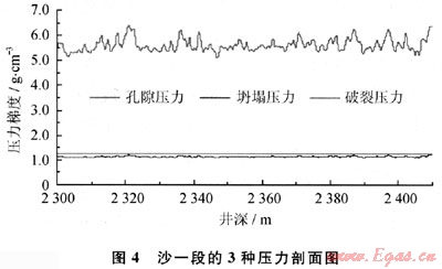 要在九龍山構(gòu)造安全開展欠平衡鉆井,前提是必須滿足井壁穩(wěn)定條件。測(cè)井資料表明,沙一段至珍珠沖組井段多含有泥巖段。因此,有必要采用泥頁巖水化模型分析坍塌壓力剖面。為此,本文利用測(cè)井資料,采用加拿大STAB-WELL欠平衡鉆井井壁穩(wěn)定分析軟件對(duì)不同層位進(jìn)行井壁穩(wěn)定計(jì)算。圖4是沙一段的3種壓力剖面。從圖4中可以看出,該段破裂壓力高,孔隙壓力梯度為1.254g/cm3,最高坍塌壓力梯度為1.094g/cm3,欠平衡設(shè)計(jì)的鉆井液密度必須要高于最低坍塌壓力梯度,設(shè)計(jì)的范圍為1.10~1.25g/cm3。圖5是千佛巖組層段的3種壓力剖面,計(jì)算結(jié)果表明,該段最高坍塌壓力梯度為1.10g/cm3,欠平衡設(shè)計(jì)的鉆井液密度必須高于最低坍塌壓力梯度,設(shè)計(jì)的范圍為1.10~1.25g/cm3。