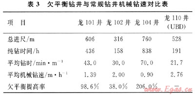 3) 龍110井的現(xiàn)場(chǎng)試驗(yàn)表明,沙一段至馬鞍山組層段開展欠平衡鉆井,能有效地提高機(jī)械鉆速,且與鄰井龍104井的常規(guī)鉆井相比,最高可達(dá)206%。