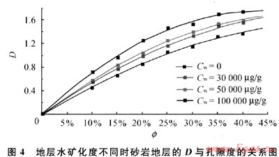 由圖4可以看出:不同礦化度地層水時(shí)熱中子計(jì)數(shù)率相對(duì)變化量(D)仍隨孔隙度的增加而增加,地層水礦化度越高變化越快;同一孔隙度條件下,地層水礦化度越大時(shí),D越大,主要由于地層水礦化度越大,對(duì)遠(yuǎn)近探測(cè)器處熱中子俘獲的能力差異越大。因此地層水礦化度越高越有利于含氣評(píng)價(jià),但需對(duì)地層水礦化度的影響進(jìn)行校正。