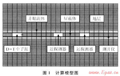 利用蒙特卡羅方法建立隨鉆條件下的計(jì)算模型,井眼直徑為20cm;地層徑向半徑分別為10~70cm、長(zhǎng)為120cm的柱體,把整個(gè)地層劃分成環(huán)距為7.5cm、厚度5cm的相鄰柵元,地層分別填充不同巖性、孔隙度和流體的物質(zhì);測(cè)井儀器外徑為45mm,脈沖中子源處于儀器左端15cm處,脈沖寬度為3μs,長(zhǎng)、短源距分別為72.5cm和42.5cm。為了簡(jiǎn)化模擬過(guò)程,沒(méi)有考慮熱中子探測(cè)器He-3管的響應(yīng),中子源和探測(cè)器間放置理想屏蔽體(圖1)。模擬時(shí)選取的截面數(shù)據(jù)庫(kù)為ENDF/B-VI.0,采用F4柵元計(jì)數(shù)方式,記錄熱中子的時(shí)間譜道寬為30μs,記錄時(shí)間間隔為30~1800μs,得到長(zhǎng)短源距處的熱中子時(shí)間譜,研究利用遠(yuǎn)近探測(cè)器熱中子計(jì)數(shù)比值相對(duì)變化量的方法來(lái)定量評(píng)價(jià)氣層。