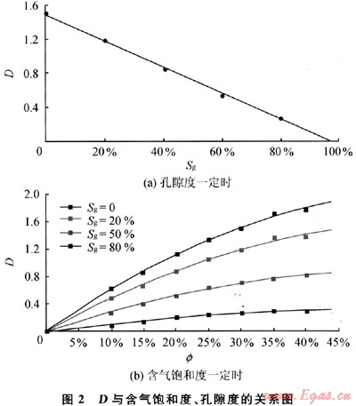 不同孔隙度和含氣飽和度地層的快中子減速長(zhǎng)度(Lf)不同,其D也不同;利用孔隙度資料和D的響應(yīng)關(guān)系可定量確定含氣飽和度。