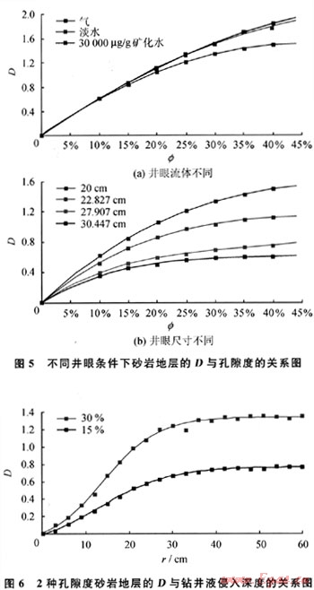 由圖5可以看出:低孔隙度地層井眼流體不同引起的相對(duì)比值差異較小,高孔隙度地層差異較大,且井眼內(nèi)充滿氣時(shí)相對(duì)變化量(D)越小,對(duì)確定含氣飽和度越不利;井眼內(nèi)流體為水時(shí),礦化度的高低對(duì)D的影響很小。在孔隙度一定的地層,井眼尺寸越大時(shí)D越小,這是主要是因?yàn)榫哿黧w為氣,井眼直徑越大挖掘效應(yīng)影響越大,故井眼尺寸越大越不利于含氣飽和度的評(píng)價(jià)。
