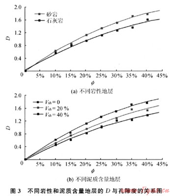 由圖3可以看出:砂巖地層和石灰?guī)r地層的相對(duì)比值(D)隨孔隙度的變化趨勢(shì)相同,在孔隙度較小時(shí)變化較大,當(dāng)孔隙度增加到一定程度時(shí)開(kāi)始變緩;孔隙度較小時(shí)不同巖性引起D的差異較小,隨著孔隙度的增加地層巖性不同D的差異越大;孔隙度相同時(shí)下砂巖地層的D要比石灰?guī)r地層的大,原因是石灰?guī)r對(duì)中子的減速能力比砂巖大;泥質(zhì)含量引起的D的差異隨孔隙度的增加而增加,且孔隙度相同時(shí)泥質(zhì)含量越大D越小。因此利用熱中子計(jì)數(shù)率比相對(duì)變化量確定含氣飽和度時(shí)受巖性和泥質(zhì)含量的影響,砂巖地層對(duì)氣反應(yīng)靈敏,泥質(zhì)含量越大對(duì)確定地層含氣飽和度越不利。