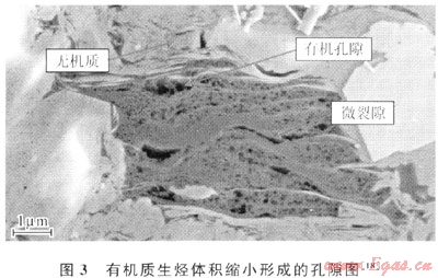 目前有研究認為,頁巖中的孔隙以有機質(zhì)生烴形成的孔隙為主(圖3)。據(jù)Jarvie等人研究,有機質(zhì)含量為7%的頁巖在生烴演化過程中,消耗35%的有機碳可使頁巖孔隙度增加4.9%[18]。有機微孔的直徑一般為0.01~1μm。