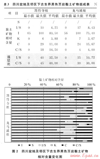 Bowker研究認為,Barnett頁巖層中黏土礦物主要為微含蒙皂石的伊利石[10]。四川盆地及鄰區(qū)筇竹寺組和龍馬溪組頁巖儲層黏土礦物分析結(jié)果也表明其組成主要是伊利石,其次為綠泥石,不含蒙皂石,有少量的高嶺石和伊/蒙混層(表3、圖2)。筇竹寺組的伊利石含量較龍馬溪組高,平均值為83.5%,I/S混層比在0~40%,平均為32.5%;龍馬溪組的綠泥石平均含量為15.67%,I/S混層比平均為10.72%。