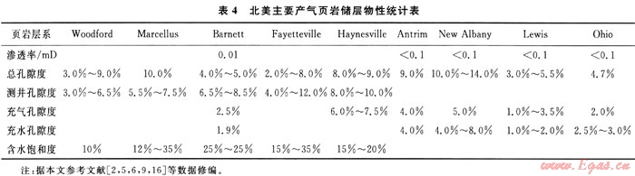 北美地區(qū)頁巖氣儲層物性評價采用了美國天然氣研究所(1996)研制的GRI頁巖巖心測定方法。該方法不僅可以測定頁巖基質(zhì)總的孔隙度,還可以測定出含氣孔隙度,且測定出的頁巖滲透率最低可達10-14mD[11]。國內(nèi)目前不具備此技術(shù),只能按常規(guī)儲層物性分析方法測試,故不能與北美頁巖物性進行比對。