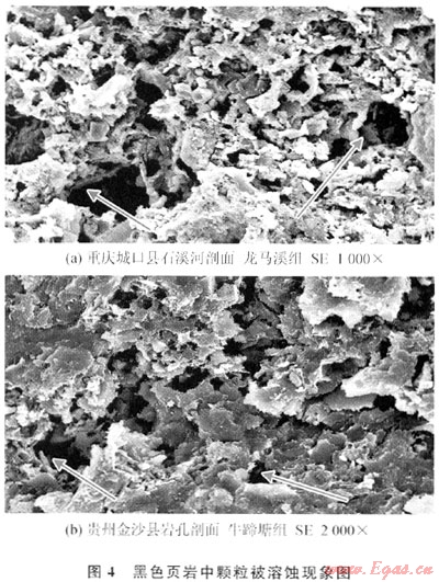 筆者在研究中亦發(fā)現(xiàn)黑色頁巖中顆粒被溶蝕的現(xiàn)象(圖4)。掃描電鏡下溶蝕孔孔徑為15~20μm,孔緣不規(guī)則。上述孔隙的觀察依賴于微米一納米級電子顯微鏡分析技術(shù)。