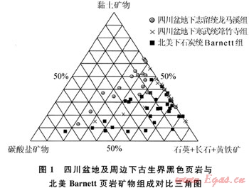 美國5大含氣頁巖的有機碳含量均較高,其中Barnett頁巖有機碳含量介于2.0%~7.0%,平均為4.5%,Antrim頁巖和New Albany頁巖有機碳含量部分超過20%,吸附氣含量最低為13%,最高可達70%(表1)。筆者依據(jù)四川盆地最新淺井及露頭分析資料,對該區(qū)下寒武統(tǒng)筇竹寺組和下志留統(tǒng)龍馬溪組頁巖進行分析,結(jié)果顯示筇竹寺組有機碳含量為1.0%~11.07%,普遍大于1%;龍馬溪組的有機碳含量一般分布在0.51%~4.88%,最高可達9%左右??梢酝茰y,四川盆地下古生界2套頁巖吸附氣含量應該是較高的。
