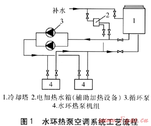 水環(huán)熱泵空調(diào)系統(tǒng)是用水環(huán)路將小型水源熱泵(水環(huán)熱泵機(jī)組)并聯(lián)在一起,構(gòu)成以回收建筑物內(nèi)部余熱為主要特征的供熱與供冷空調(diào)系統(tǒng)。這種系統(tǒng)要求建筑物內(nèi)部具有可回收的余熱,通過(guò)循環(huán)水將這些余熱分配到需熱區(qū)域,在不需要外界任何能量情況下,不同區(qū)域的水環(huán)熱泵機(jī)組可同時(shí)從循環(huán)水中取熱與放熱,實(shí)現(xiàn)同時(shí)供熱與供冷的效果。水環(huán)熱泵空調(diào)系統(tǒng)工藝流程見(jiàn)圖1。