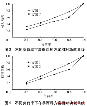 不同負(fù)荷率下夏季兩種方案相對(duì)功耗曲線見(jiàn)圖3,以夏季100%負(fù)荷率下的功耗作為計(jì)算基礎(chǔ)。由圖3可知,夏季,方案1的相對(duì)功耗與負(fù)荷率近似呈線性關(guān)系。方案2在負(fù)荷率為0.2~0.8范圍內(nèi),其相對(duì)功耗與負(fù)荷率也具有近似線性關(guān)系。在負(fù)荷率為0.8~1.0范圍內(nèi),其相對(duì)功耗發(fā)生劇烈變化,即負(fù)荷率為0.8是方案2相對(duì)功耗曲線的拐點(diǎn)。
