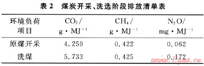 根據本文參考文獻[4]的統(tǒng)計,煤炭在開采、洗選(包括坑口附近的短距離運輸)階段的排放清單如表2。