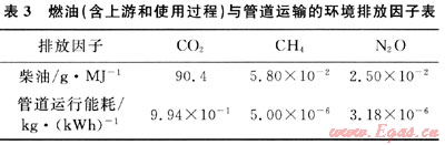 運輸階段的污染物排放主要來自于燃料燃燒(汽油和柴油)的排放。不同的運輸方式,其燃料種類、能源強度及燃料燃燒排放系數均不同。其中,汽車、油輪、貨船和火車的單位載重單位里程燃料消耗量分別為0.10267、0.10062、0.10030、0.10072kg/(t·km),燃油的生命周期溫室氣體排放[5~6]見表3。