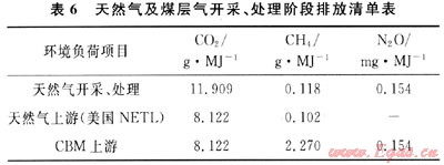 煤層氣(CBM)現(xiàn)階段總體利用率不高,分為地面抽采和井下抽采兩種。這里主要考慮具有大規(guī)模開發(fā)價值的地面抽采,典型的CBM中CH4含量普遍在95%左右,取地面抽采利用率為70%。由于普遍缺乏CBM開采與處理過程中的排放資料,這里參照天然氣的開采階段清單,但甲烷排放量有所提高。參見表6。